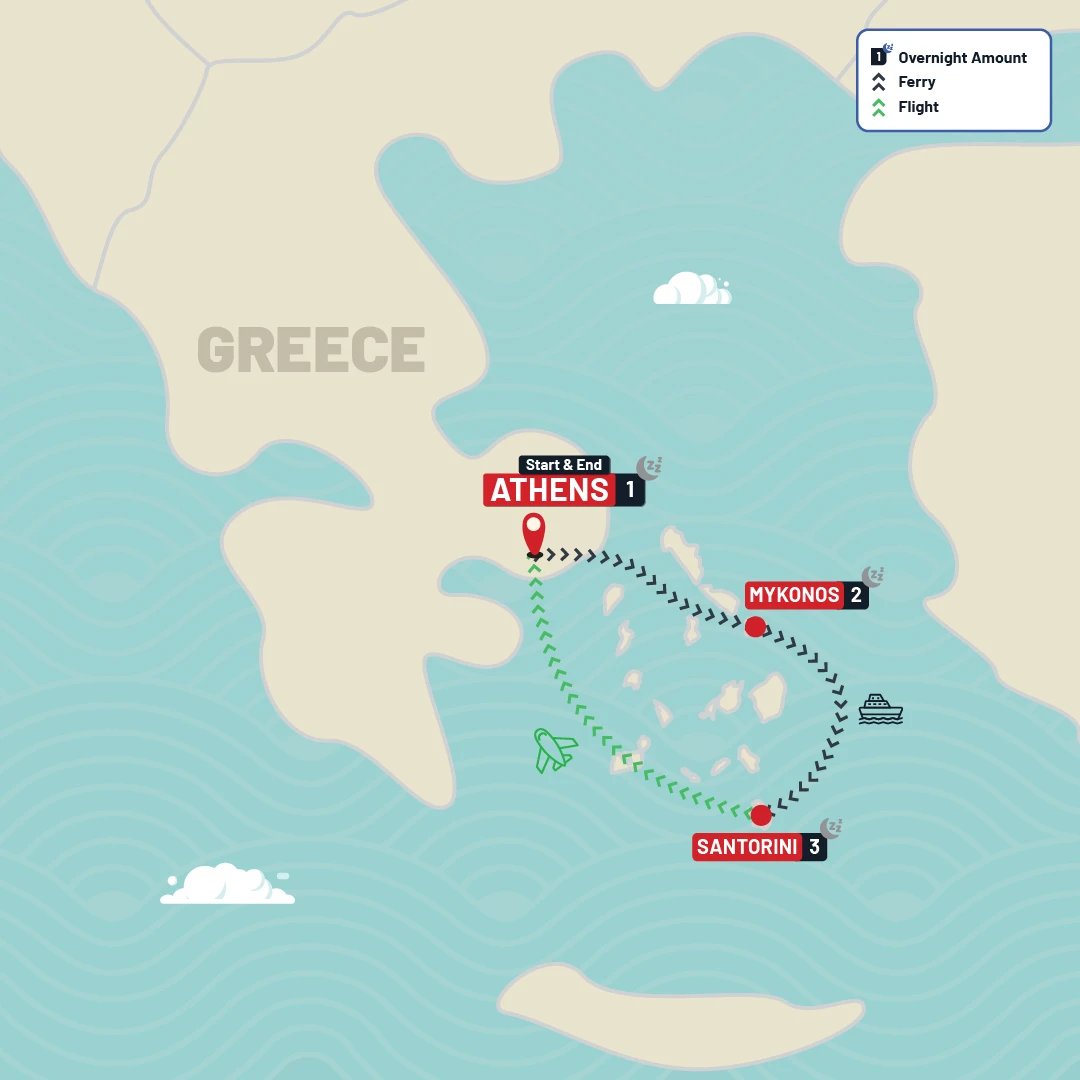 Athens, Mykonos & Santorini – If you have just a week and want to focus on the islands, this 7-day tour covers Athens and the two most iconic Greek islands. After exploring the capital, ferry to Mykonos for beach time and nightlife, then to Santorini for those famous sunsets before flying back to Athens.