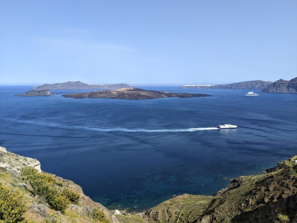 - Nea Kameni – Throughout your stay in Santorini, you will marvel at the view of the caldera with the newly formed volcano in the centre. Venturing over to that volcano (New Kameni) offers a spectacular view looking back in the opposite direction to Thira. But it is a bit of a hike that would take 20-30 minutes to accomplish. Accessible only by joining one of the many boat cruises on offer (see boat cruises above).